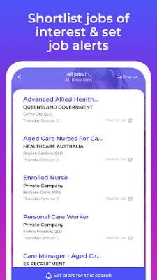 • Register to create a personal shortlist of jobs and apply.Download the Aged Care Jobs Australia App for access to all Aged Care industry jobs Australia wide.