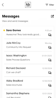 Boost customer satisfaction: Homebuyers can connect with KB team members via the app, which can improve problem solving and lessen misunderstandings.