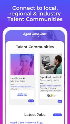 CONNECT WITH TALENT COMMUNITIES THAT NEED YOUR SKILLS AND EXPERIENCEThe Aged Care Jobs Australia App connects you to local, regional, project and industry based Talent Communities so you can access exclusive employment opportunities from employers. Talent Communities also connect you to work, education, events, support and information for employment options and career pathways of interest.