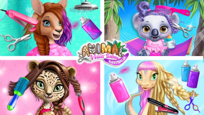 Crazy Animal Hair Salon goes to sunny Australia! Pack your hairstyling tools and get ready for new virtual pet fashion makeovers and animal beauty salon adventures! Meet the cute pet beauty salon clients: leopard Amy, baby koala Maggie, kangaroo Sydney and snake Crystal. Help your new pet friends express themselves through style with crazy haircuts, beautiful makeup and fashionable outfits in the best pet beauty salon game for girls!