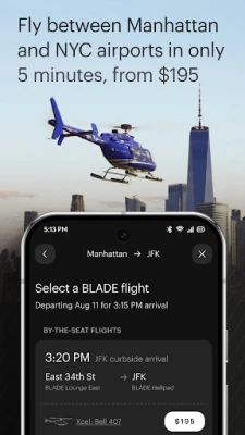- Fly to or from the airport. BLADE helicopters will get you there in 5 minutes, all day long, from $195.