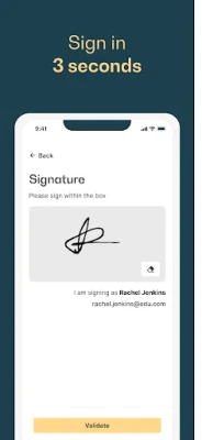 Electronic signature in 3 seconds: Log in via the e-mail address provided by your school, sign with your finger and scan the QR code. Your attendance is recorded instantly.