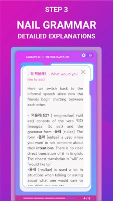1. Every lesson consists of a specific Korean exercise routine that is designed to let the student master the Korean grammar and Korean vocab to achieve fluency level.