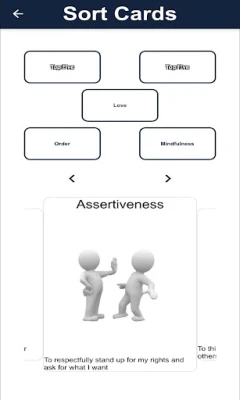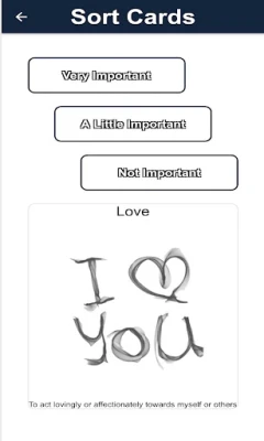 This app shows 56 different personal values and allows the user to sort them into categories of Very Important, A Little Important, and Not Important before moving on to selecting the top five most important values to them at this moment and finally a final value to focus on. A values sort is a useful exercise for anyone who wants to reflect on what is most meaningful and important to them at this moment in time, but particularly for anyone who is focusing on Acceptance and Commitment Therapy skills.